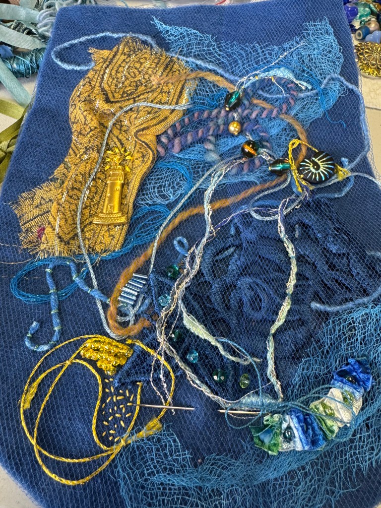 Although I didn’t come to the class with any real pre-conceived ideas of what story I would tell on my bag-there just happened to be two lighthouse charms in my bag of goodies. A blue felt base seemed to need some gold fabric, yarn, threads, and a gold lighthouse to start my story. I think the quilt shop in A Stitch in Time should have expanded it’s inventory to hold some of these things!