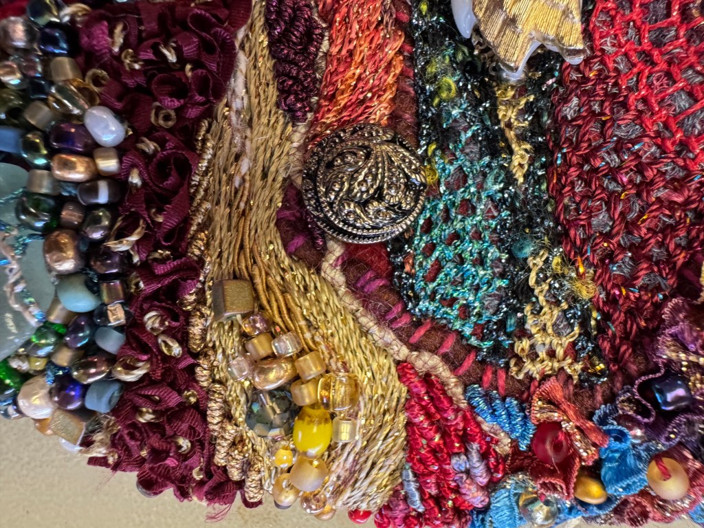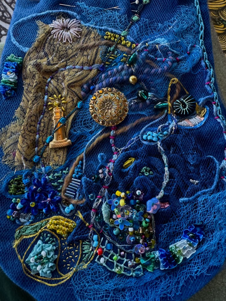 The class was Storyteller Bags by Julie Booth. I’ll include a picture or two of her work as well as mine. It will take a while to finish but will be gorgeous when done. A true work of art covered in stitching, beads, sequins and vintage buttons. Her bag is red! The blue pics are my bag in process.